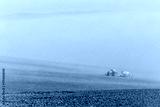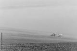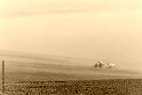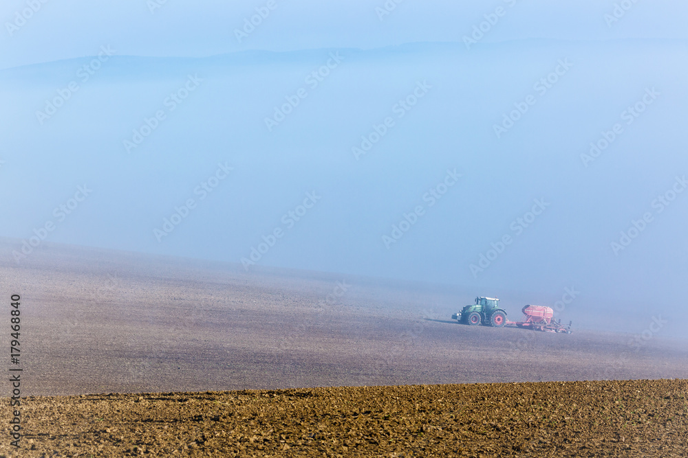 Beautiful misty foggy autumn landscape with working tractor in south moravia, Czech Republic. Agriculture concept.