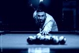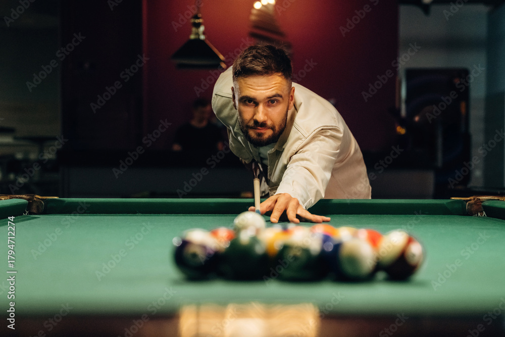 Using cue stick. Handsome man with a pool table game