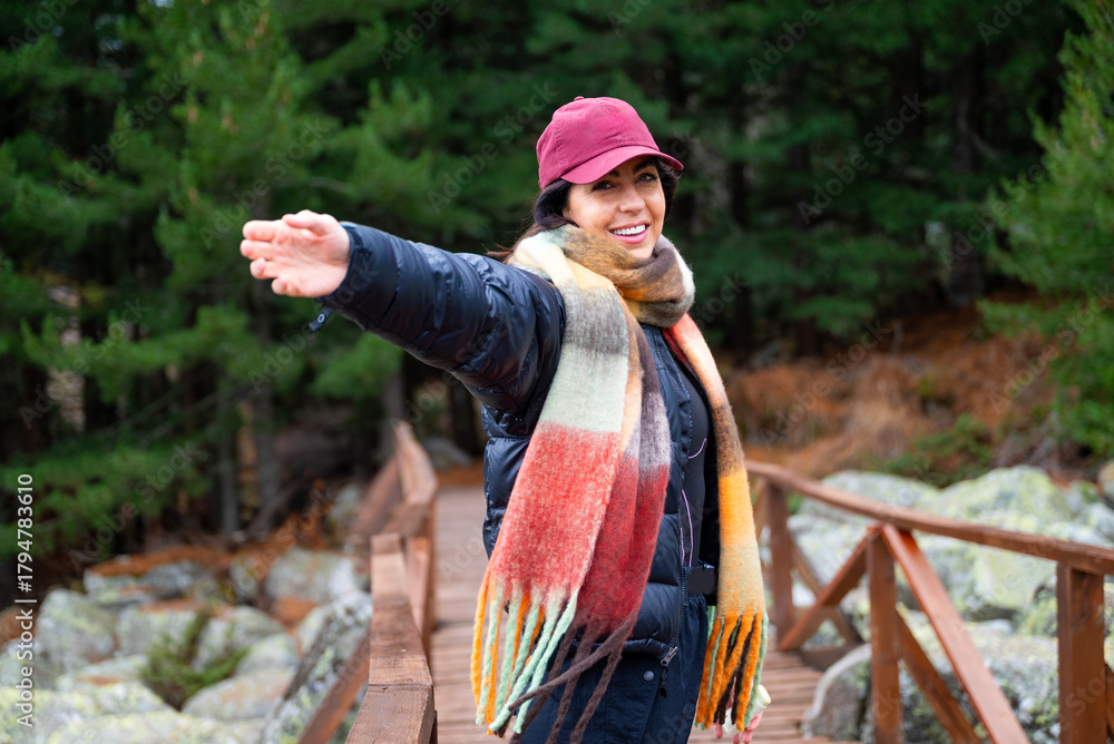 Beautiful young smiling woman standing in the autumn mountain