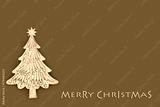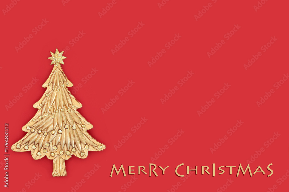 Merry Christmas gold tree festive decoration with phrase on red background. Minimal Xmas design for greeting card, label or gift tag.