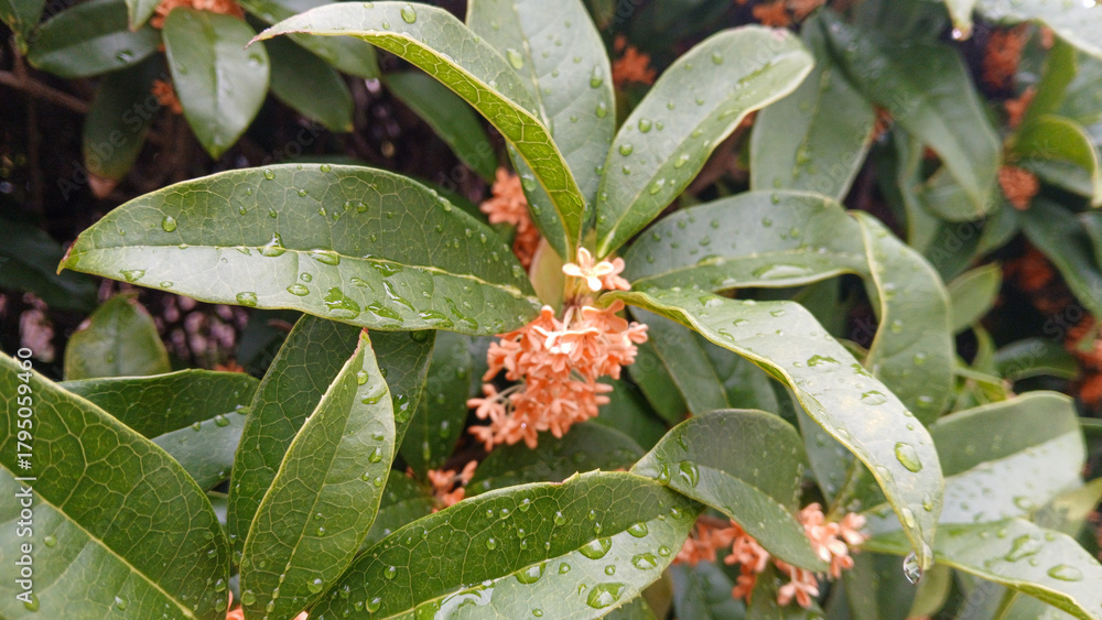 A close up of vibrant orange osmanthus flowers with fresh water drops on green leaves