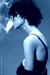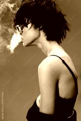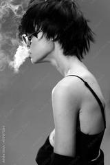 Black and white portrait of a young woman exhaling smoke, featuring short hair, glasses, and a stylish outfit with a dark background.