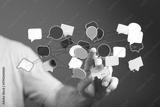 Abstract concept of online communication and networking with connected message bubbles, hand interaction and da