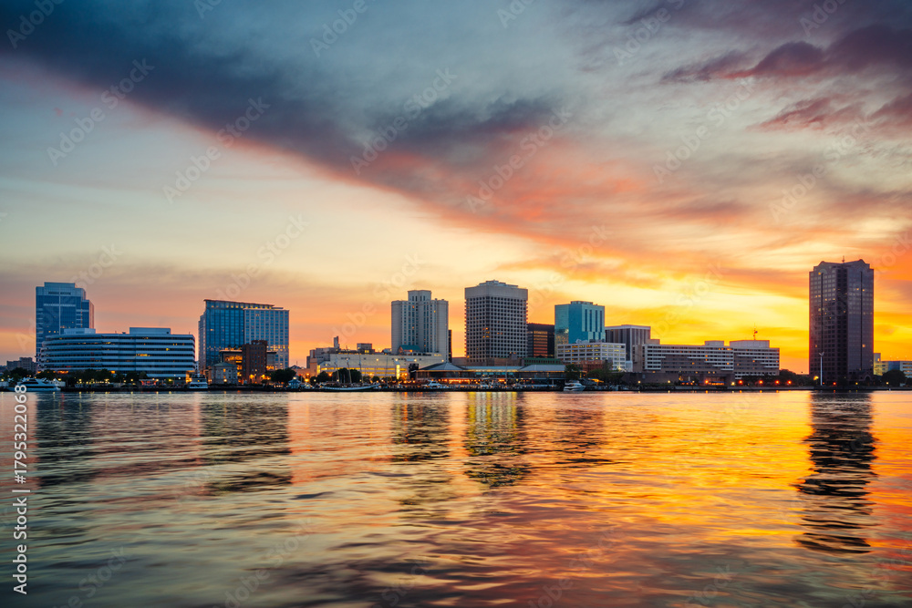 Norfolk, Virginia, USA downtown city skyline with dramatic morning clouds on the Elizabeth River