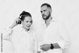 Male business professionals pose against a clean, isolated colored background, showcasing focus and confidence with listening engagement and a thoughtful expression.
