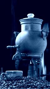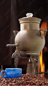Antique copper coffee maker with cup and coffee.