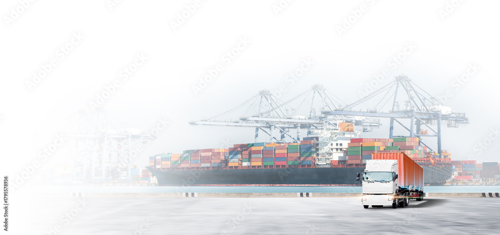 Global cargo transportation, container shipping, and port logistics. Truck delivering freight at a terminal.
