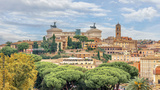 Rome, Italy. Scenic view of historic architecture surrounded by lush greenery and vibrant trees, showcasing a beautiful urban landscape with a blend of nature and city life