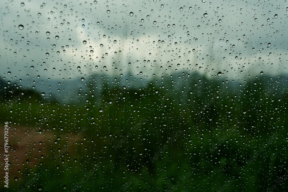 A closeup shot of the glass of a window covered by rain droplets for backgrounds and textures.