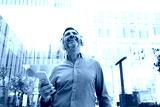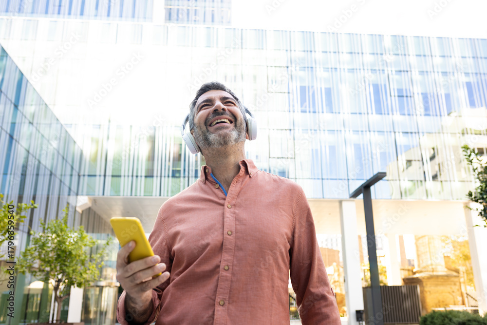 Happy mature man wearing headphones listening to music with phone app in the city.
