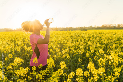 Mixed Race African American Girl Teenager Runner Drinking Water at Sunset