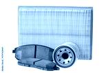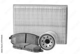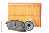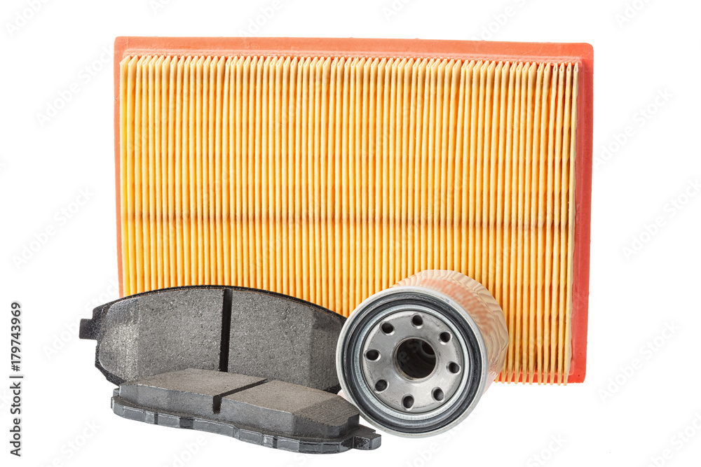 Set of brake pads, oil filter, air filter. Car spares isolated on white