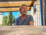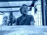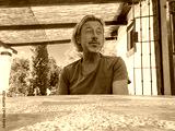 Expressive man with half long blond hair and grey stubble beard in grey t-shirt sitting by table on outside sunny patio.