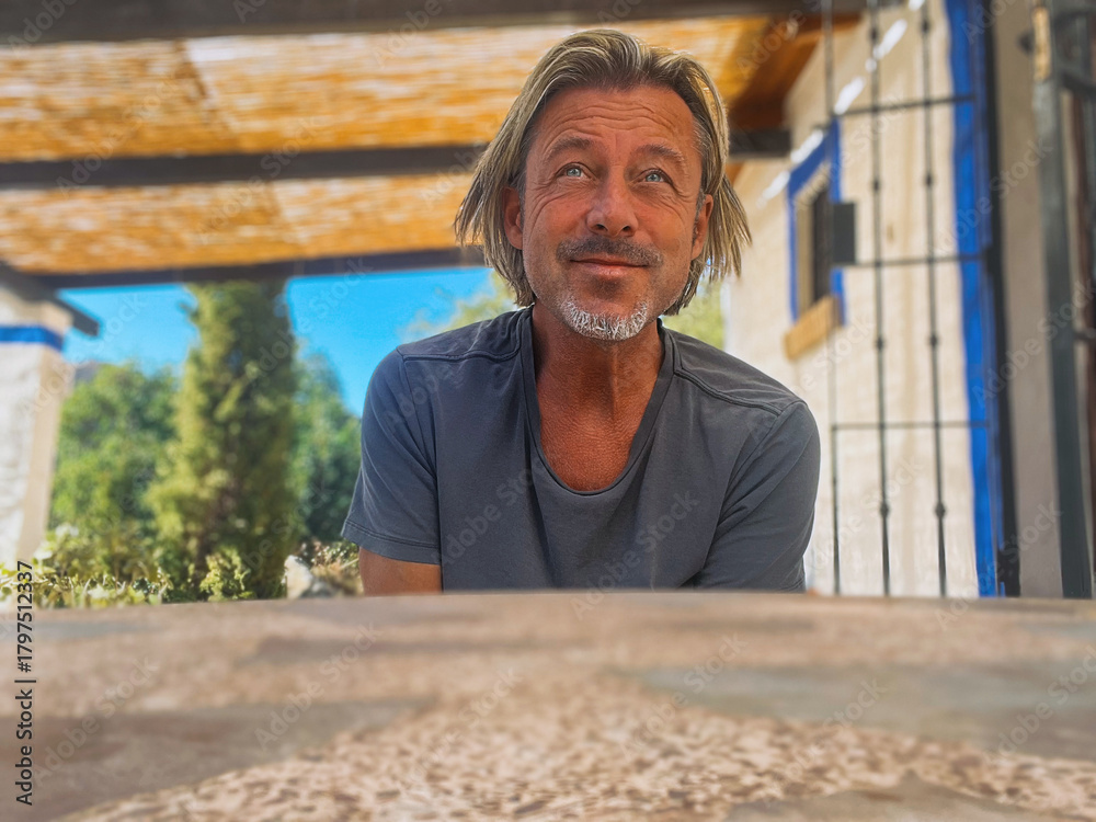 Expressive man with half long blond hair and grey stubble beard in grey t-shirt sitting by table on outside sunny patio.