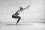 Caucasian slim woman in pink sportswear practice chair pose indoor in loft fitness studio, Utkatasana.