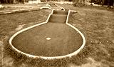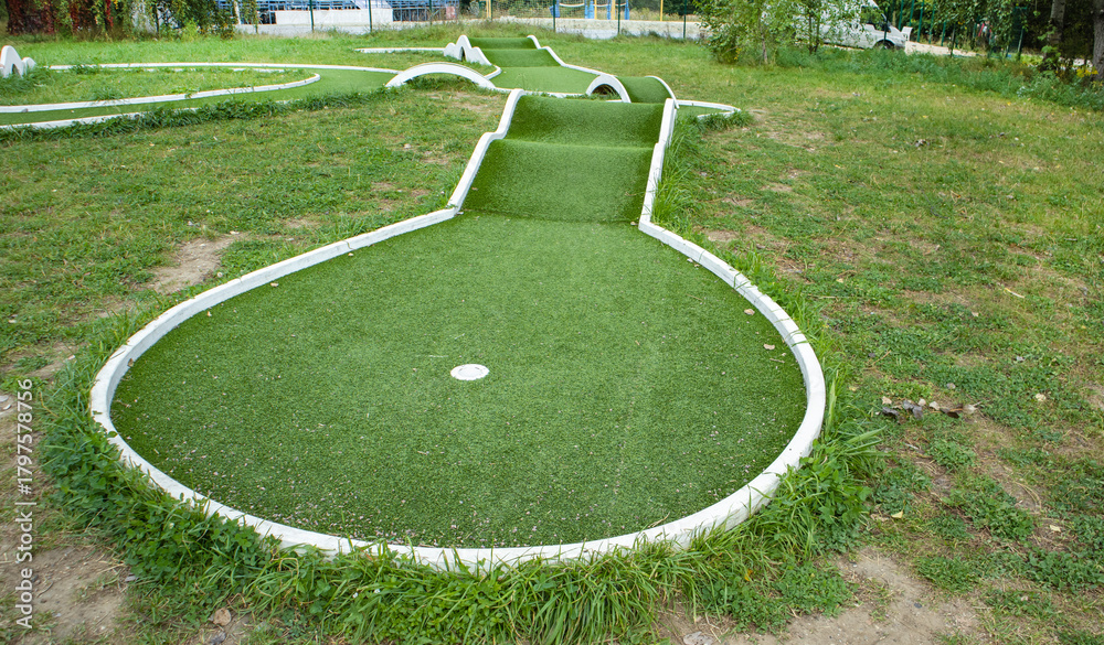 Mini golf hole with artificial turf and obstacles family fun horizontal
