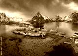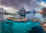 Aerial view of Hamnoy fishing village with yellow rorbuer, turquoise water in Lofoten, Norway. Scenic coastal landscape with snowy mountains, wooden houses, sea, rorbu, dramatic arctic sky. Top view