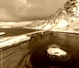 Aerial view of a bridge over turquoise Arctic water in Lofoten Islands, Norway. Snow-covered mountains, road and coastline in winter. Scenic northern dramatic landscape. Top drone view of road and sea
