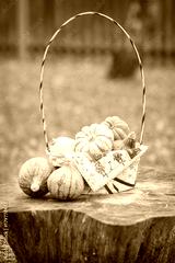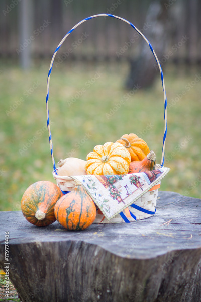 Basket with different colorful small pumpkins in the yard in autumn: courtyard decoration