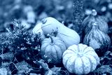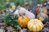 Different colorful pumpkins on the grass and leaves during the fall in autumn