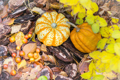 Different colorful pumpkins on the grass and leaves during the fall in autumn
