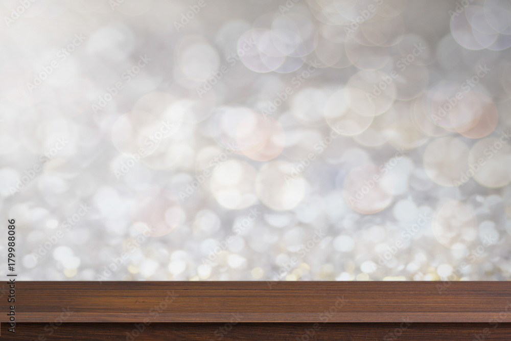 old brown and vintage top wooden shelf floor texture background, can be used display product in Christmas day on gray and white bokeh background.