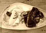 A generous plate serving creamy mashed potatoes and a portion of braised pork meat topped with a rich, dark brown sauce