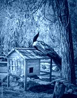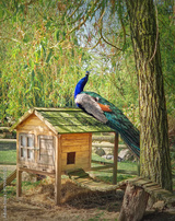 A magnificent peacock perches on a wooden coop. Beautiful blue and iridescent teal feathers stand out against the natural surroundings, beneath the shade of a willow tree