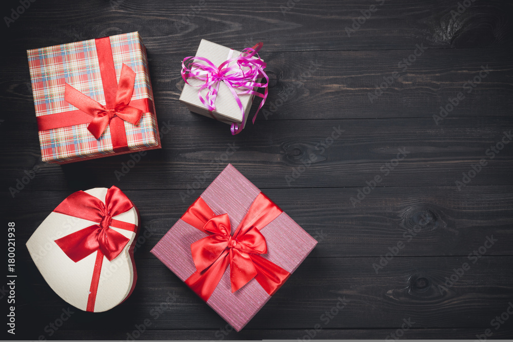 Colorful gift boxes on nice dark wooden background. Christmas or valentines day background with free space.