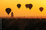 Silhouette of hot air balloon over Bagan at sunrise in misty morning, Myanmar