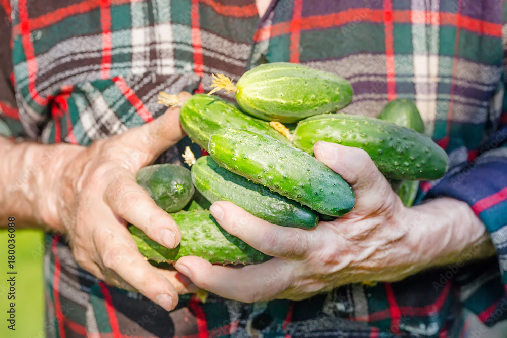 Agriculture, farming and gardening concept. Detail of wrinkled man hands holding cucumbers at farm greenhouse