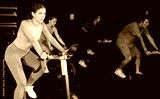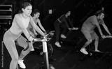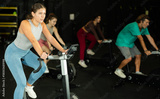 Determined young girl training with spin bike in fitness hall during full-body workout