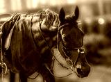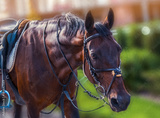 Horse looking straight forward closeup on show jumping competition, green blur background. Bay dressage horse under the saddle. Sunny day, concept for banner, website, poster.