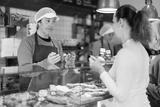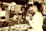 Salesman offers bakery customers to buy fresh baked goods
