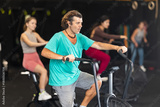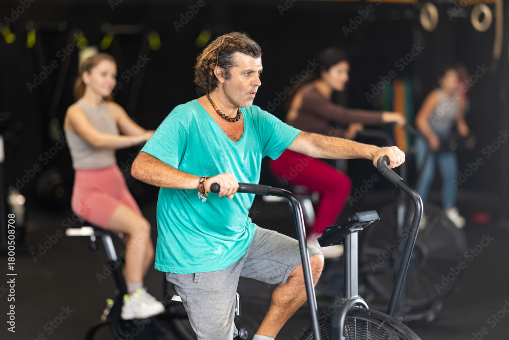 man, male, guy, person, adult, middle-aged, 40-50, sportsman, gym-goer, attendee, attendee, air, bike, European, Russian, sportive, determined, diligent, training, riding, practicing, attending