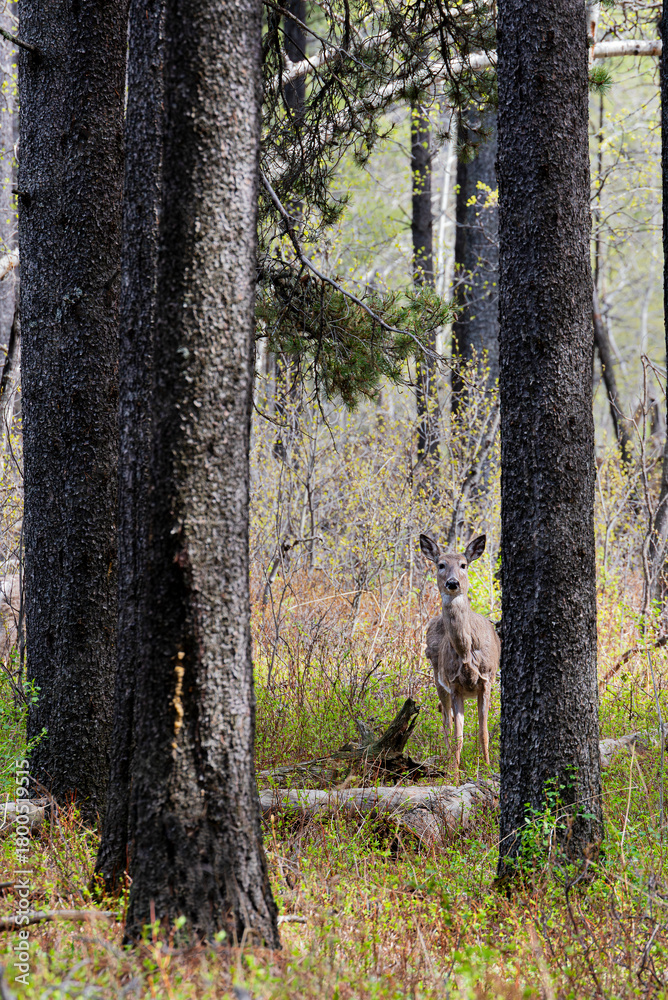 Single deer in a lodgepole pine forest in Cypress Hills Interprovincial Park in Saskatchewan, Canada