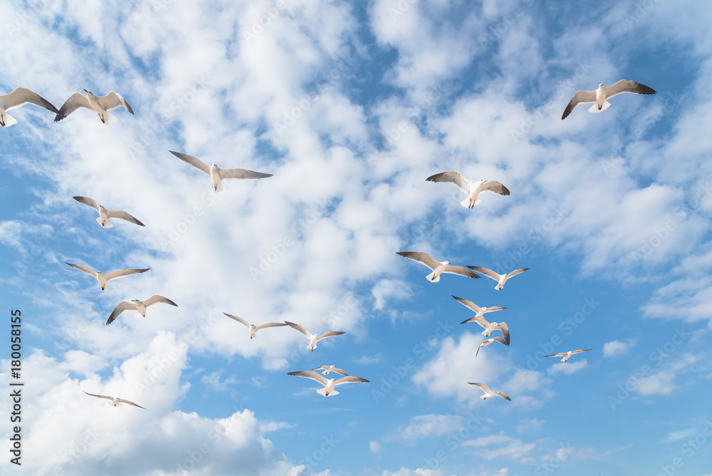 Close-up a group of large white seagulls soaring in the cloud blue sky. White wild birds flying against the sky. Concept for freedom.