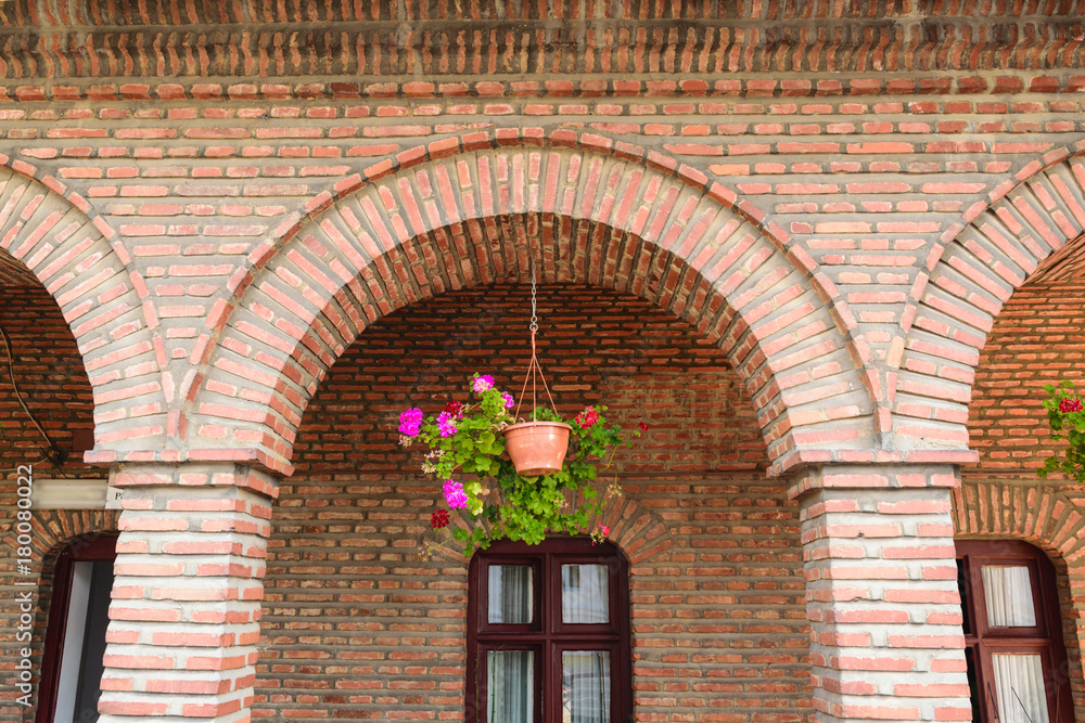 detail of red vintage brick arcades, brown windows frame and hanging geranium flower pot
