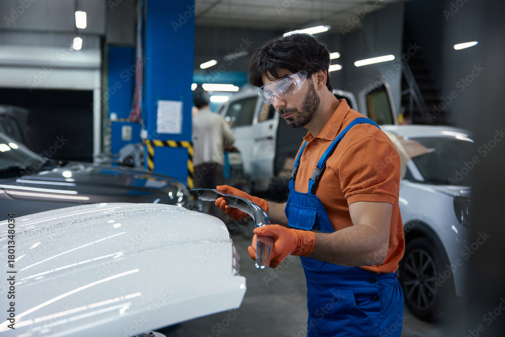 Auto body technician repairing car hood in professional garage workshop with safety gear