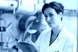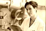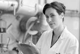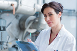woman wearing labcoat and holding clipboard in industrial setting