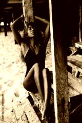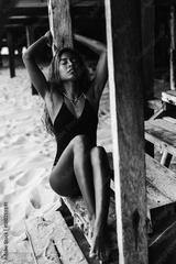 Young attractive dark skinned woman sitting on stairs at beach
