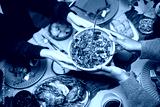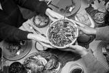 Diverse group of young adult and middle aged hands serving salad at Thanksgiving dinner table, sharing food among friends, visible plates with turkey, vegetables, and festive dishes