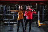 Beautiful shape young girl in sportswear doing shoulders exercise with dumbbells while personal trainer standing next to her and looking at the camera in the gym.