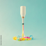 Chamagne bottle with party streamers. Party minimal concept. New Year countdown.