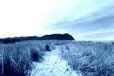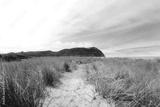 Scenic beach on Oregon's coast with sandy trail on grassy coastline