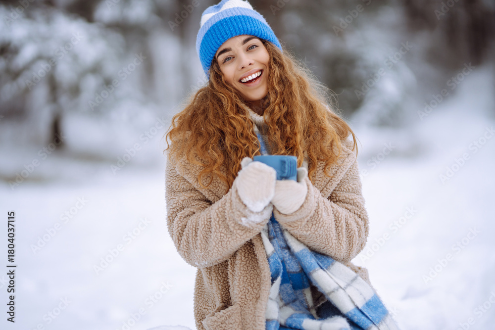 A smiling woman in bright scarf and hat pours a hot drink from thermos in snowy forest. A beautiful woman enjoys winter scenery and drinks tea. Conceptual images of nature, relaxation, drinks.