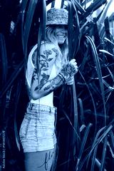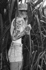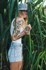 Portrait of beautiful young tattooed smiling woman standing in green leafy bush