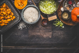 Pumpkin risotto cooking ingredients on dark rustic kitchen table with bowls, spoon and pan, top view, border. Vegetarian food, Clean seasonal eating
