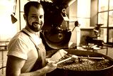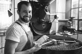 Portrait of cheerful bearded worker using tablet while locating near coffee roaster with spinning cooler professional machine. Industry concept