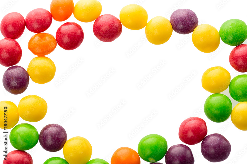 Multicolored candies isolated on white background with copy space.